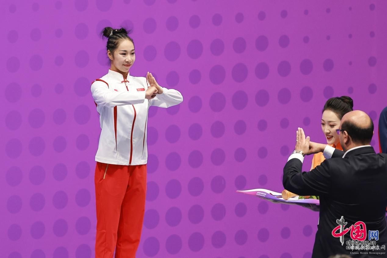 9月27日,杭州第19屆亞運(yùn)會武術(shù)女子劍術(shù)槍術(shù)全能決賽在蕭山瓜瀝文化體育中心舉行,中國選手賴曉曉19.6分的優(yōu)異成績摘取桂冠。圖為賴曉曉和頒獎嘉賓相互抱拳施禮。中國網(wǎng)記者 董寧 攝影