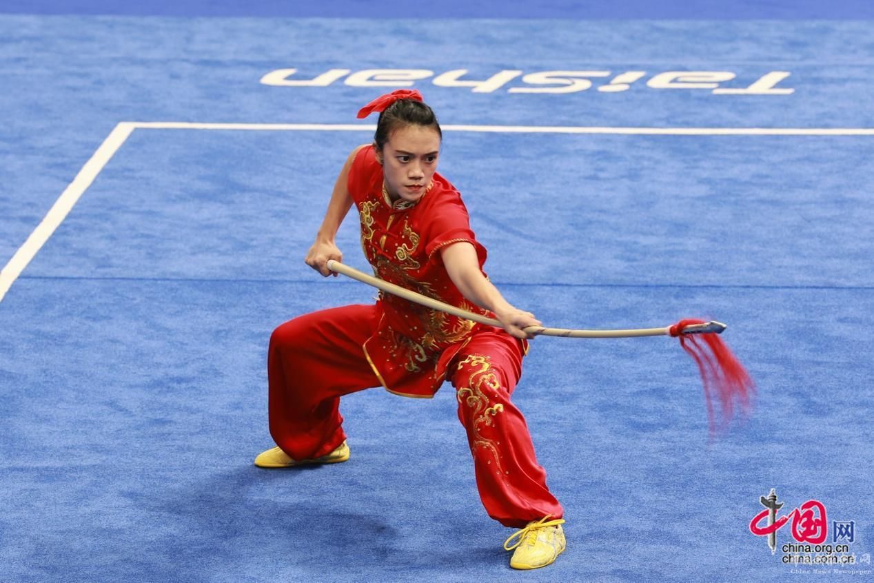9月27日,杭州第19屆亞運(yùn)會武術(shù)女子劍術(shù)槍術(shù)全能決賽在蕭山瓜瀝文化體育中心舉行,中國選手賴曉曉19.6分的優(yōu)異成績摘取桂冠。圖為槍術(shù)決賽。中國網(wǎng)記者 董寧 攝影