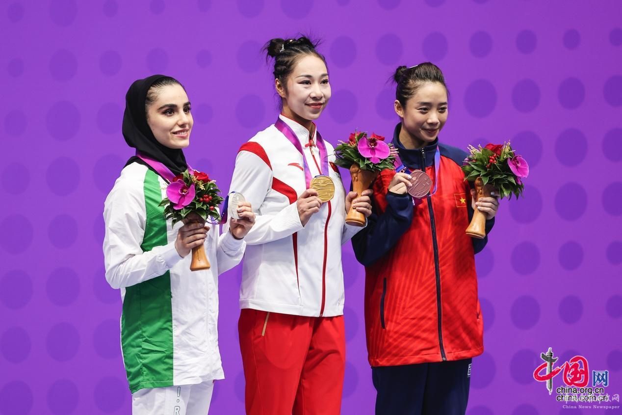 9月27日,杭州第19屆亞運(yùn)會武術(shù)女子劍術(shù)槍術(shù)全能決賽在蕭山瓜瀝文化體育中心舉行,中國選手賴曉曉19.6分的優(yōu)異成績摘取桂冠。圖為獲獎選手在領(lǐng)獎臺合影。中國網(wǎng)記者 董寧 攝影