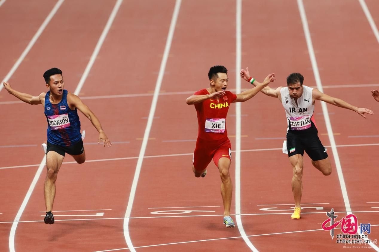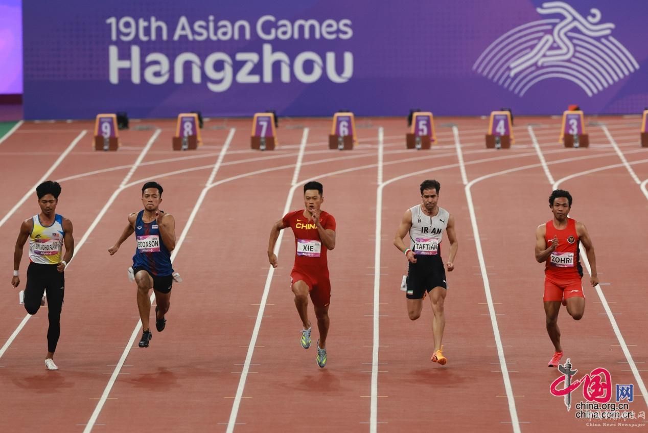 9月30日晚,杭州亞運(yùn)會(huì)男子100米決賽中,30歲的謝震業(yè)以9秒97的成績(jī),奪得金牌。他是決賽中唯一一名突破10米大關(guān)的選手,9秒97也是他的個(gè)人最好成績(jī)。圖為謝震業(yè)(左二)在比賽中。中國網(wǎng)記者 董寧 攝影