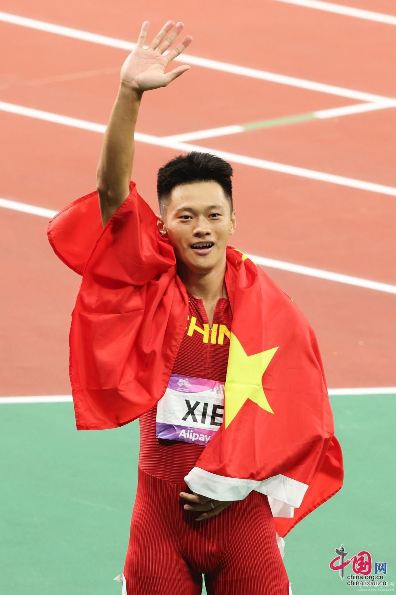 9月30日晚,杭州亞運(yùn)會(huì)男子100米決賽中,30歲的謝震業(yè)以9秒97的成績(jī),奪得金牌。他是決賽中唯一一名突破10米大關(guān)的選手,9秒97也是他的個(gè)人最好成績(jī)。圖為謝震業(yè)奪冠后慶祝勝利。中國網(wǎng)記者 董寧 攝影