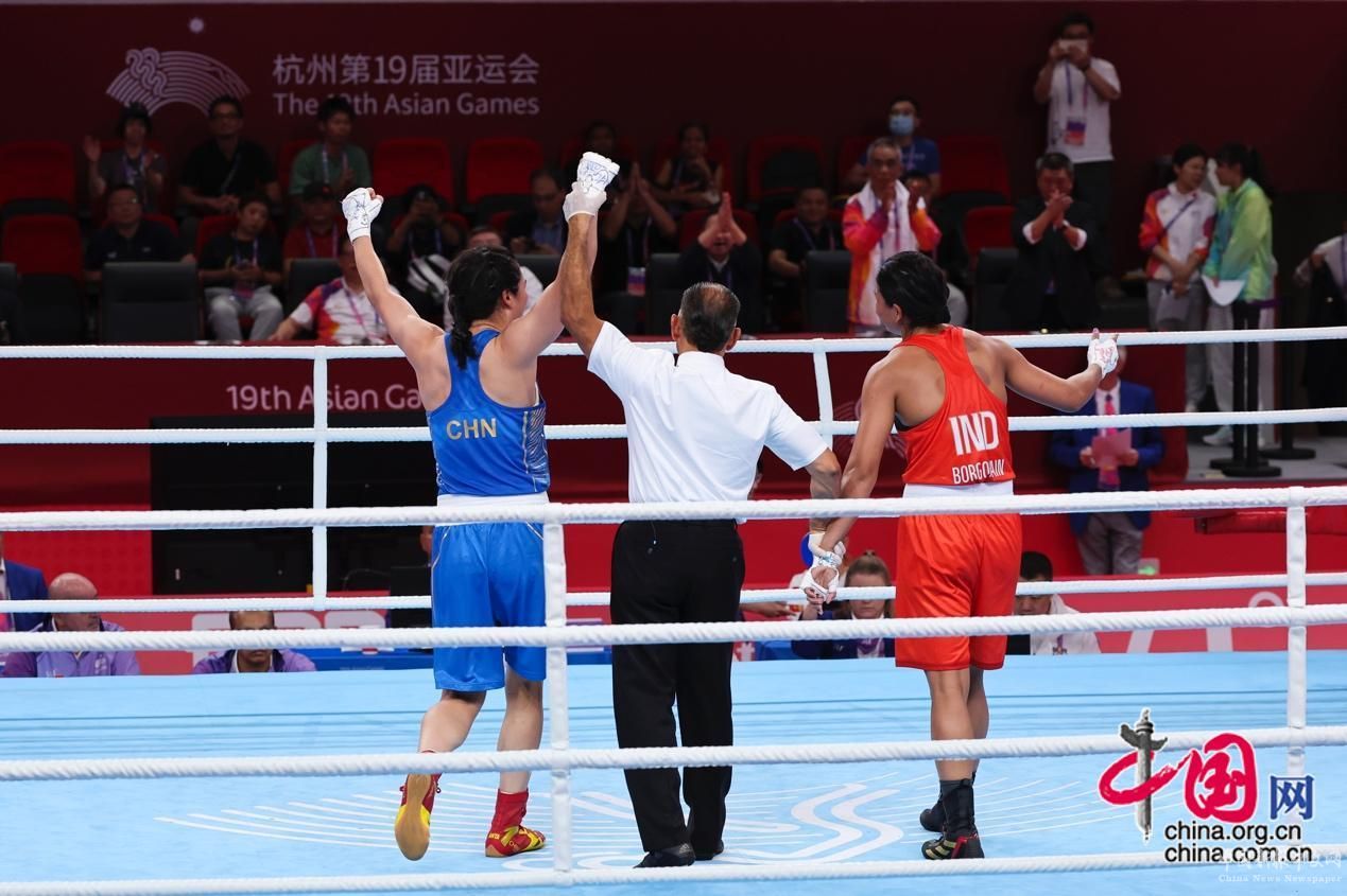 10月4日,在杭州亞運(yùn)會(huì)拳擊項(xiàng)目女子75公斤級(jí)決賽中,東京奧運(yùn)會(huì)銀牌得主、中國(guó)選手李倩戰(zhàn)勝印度選手洛夫利娜·博爾戈哈因,獲得冠軍。圖為比賽結(jié)束,裁判宣布李倩獲勝。中國(guó)網(wǎng)記者 董寧攝影