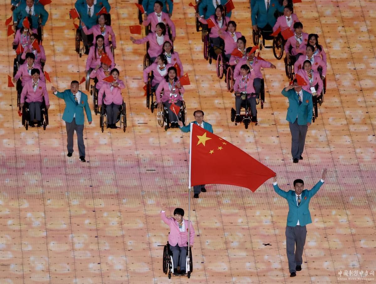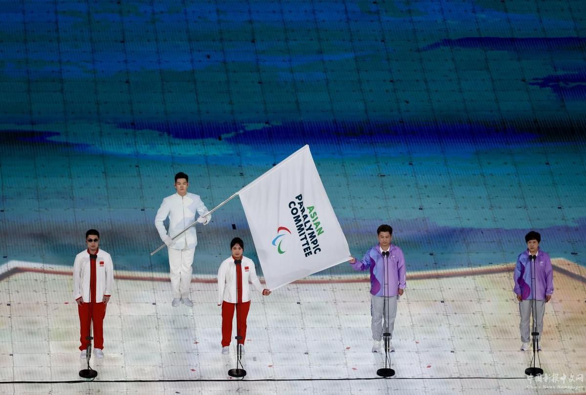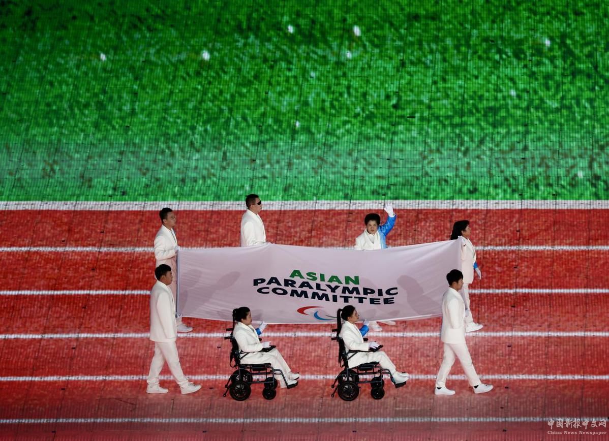 10月22日,亞殘奧委員會(huì)會(huì)旗在開(kāi)幕式上入場(chǎng)。中國(guó)日?qǐng)?bào)記者 魏曉昊 攝