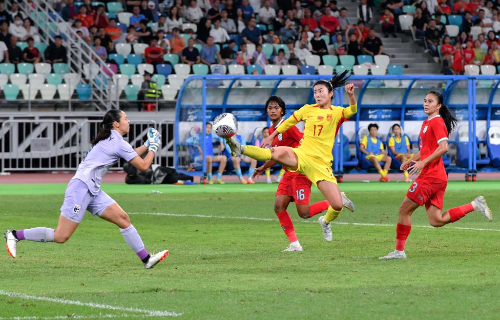 第15分鐘,陳巧珠左路長傳進(jìn)禁區(qū),閆錦錦插上凌空墊射破門,為中國隊打破僵局。整個上半場,中國隊狂轟對方球門12次,但多次錯失得分良機(jī),泰國隊門將也做出幾次精彩撲救,中國隊始終未能擴(kuò)大比分。
