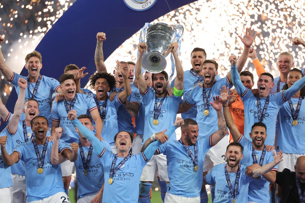 這是2023年6月10日,曼城隊(duì)在頒獎(jiǎng)儀式上慶祝奪得歐冠冠軍。新華社發(fā)