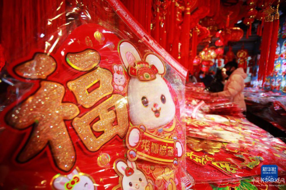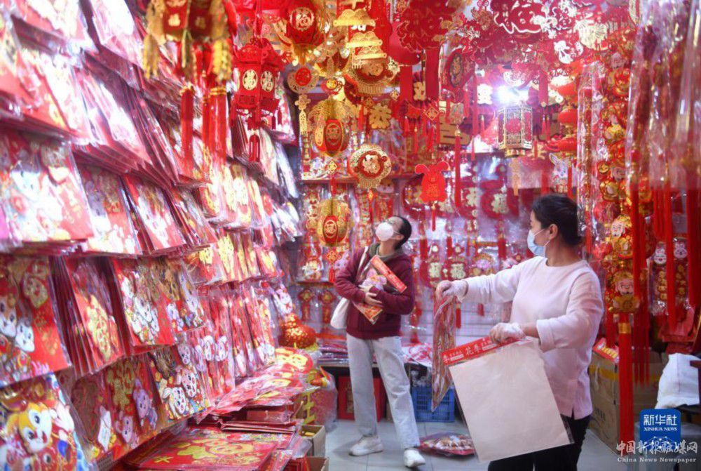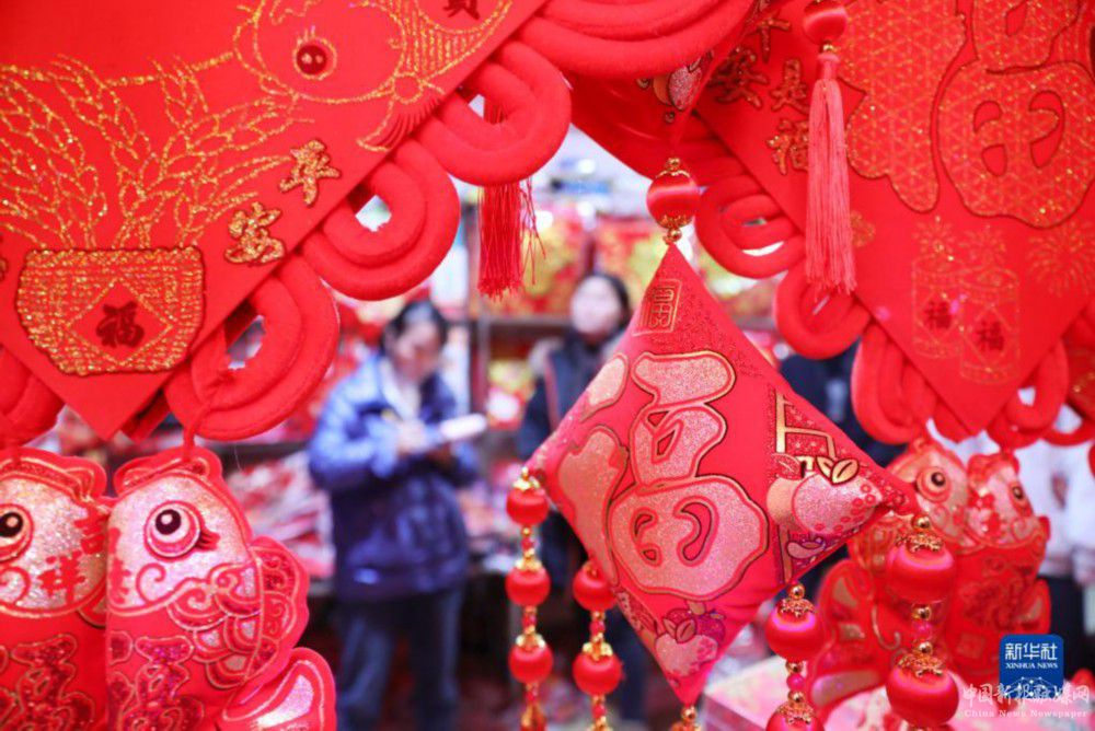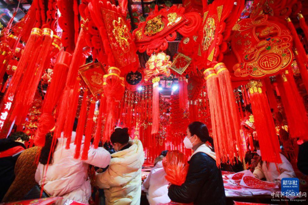 春節(jié)臨近,多地年貨市場紅火起來,人們選購春節(jié)飾品,迎接新春佳節(jié)。新華社記者 盧漢欣 攝