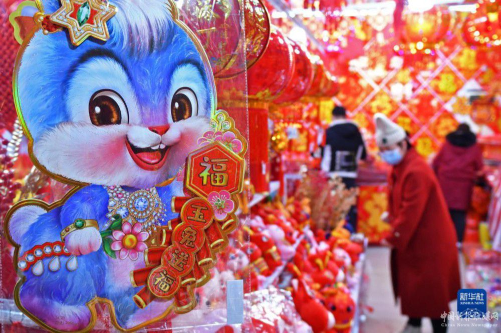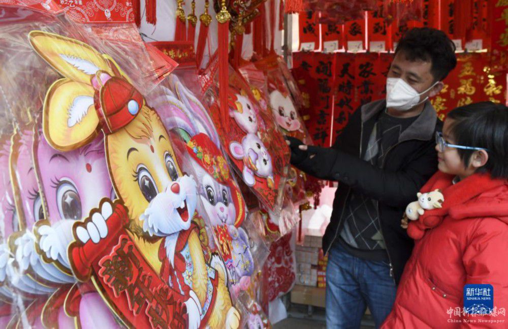 1月9日,在山東省煙臺市芝罘區(qū)三站節(jié)慶用品市場,居民在選購春節(jié)飾品。新華社發(fā)(孫文潭 攝)