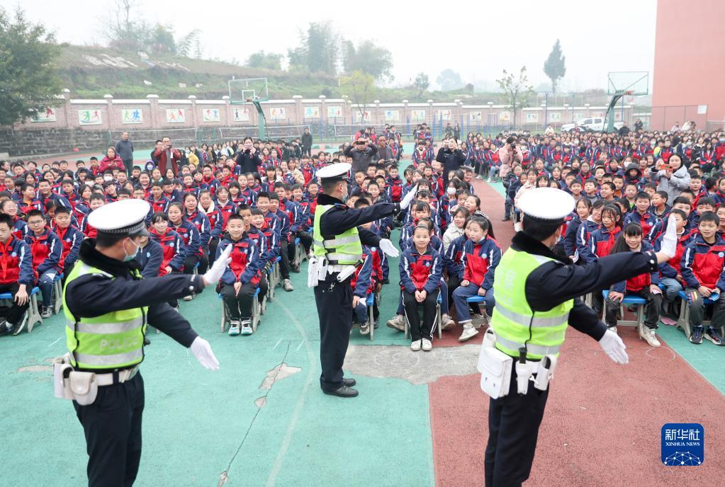 2月8日,四川省華鎣市交警在銅堡中學(xué)給學(xué)生展演交通安全手勢操。