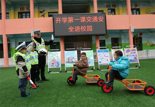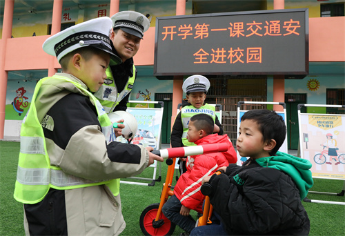 2月10日,在湖南省保靖縣清水坪學(xué)校幼兒園,交警給小朋友講解交通安全知識。當(dāng)日是保靖縣中小學(xué)春季開學(xué)第一天,該縣公安局交警大隊組織交警深入多所中小學(xué)開展“文明交通宣傳進校園”活動。交警們通過現(xiàn)場講解、展板展示、現(xiàn)場互動等方式,為學(xué)生普及交通安全知識,以增強少年兒童交通安全意識和自我保護能力。( 俞采華 彭  博)