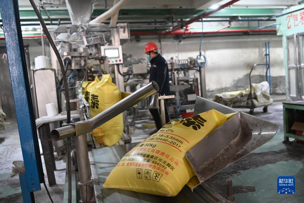 2月16日,在貴州省貴陽(yáng)市開(kāi)陽(yáng)縣一家化肥生產(chǎn)企業(yè),工人駕駛叉車(chē)轉(zhuǎn)運(yùn)準(zhǔn)備外銷(xiāo)的化肥(無(wú)人機(jī)照片)。