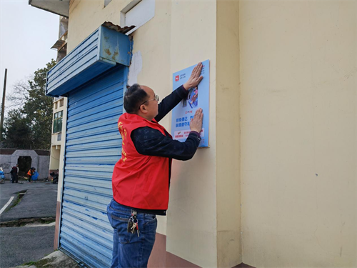 社區(qū)工作人員張貼文明創(chuàng)建宣傳畫。