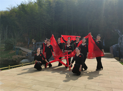 2023年3月9日,陽春三月,春光明媚,在安徽省合肥市廬江縣礬山鎮(zhèn)竹溪喬沖鄉(xiāng)野度假營地,游客和舞蹈達(dá)人正在展示舞姿、拍攝影像,共享美好春天。