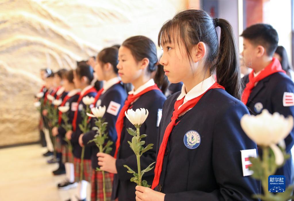 4月3日,合肥市六安路小學(xué)翠微分校的少先隊(duì)員代表在蜀山烈士陵園緬懷先烈。