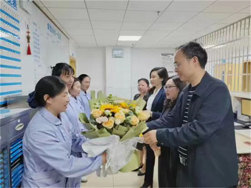 當天,一早,院領(lǐng)導們紛紛來到各個臨床科室看望慰問辛勤耕耘在臨床一線的護理同仁們,每到一處,都與護士們親切交談,為他們送上鮮花和節(jié)日祝福,并感謝他們在護理崗位上的堅守與奉獻。