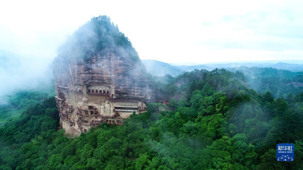 當(dāng)日,甘肅天水煙雨蒙蒙,麥積奇峰時(shí)隱時(shí)現(xiàn),呈現(xiàn)出“麥積煙雨”景觀。