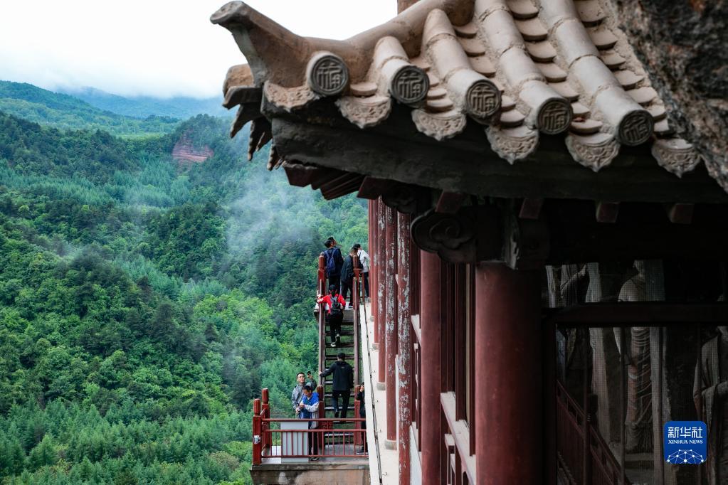 5月31日,游客在麥積山石窟游覽。