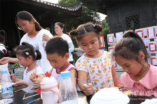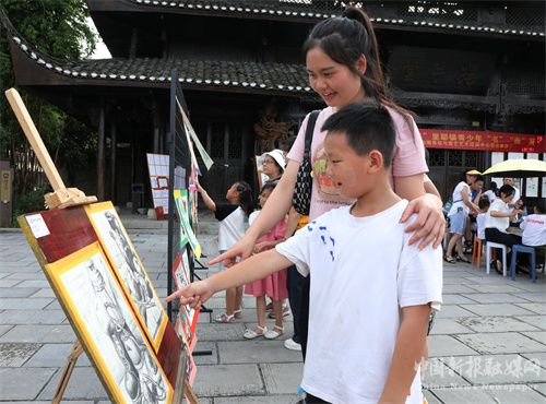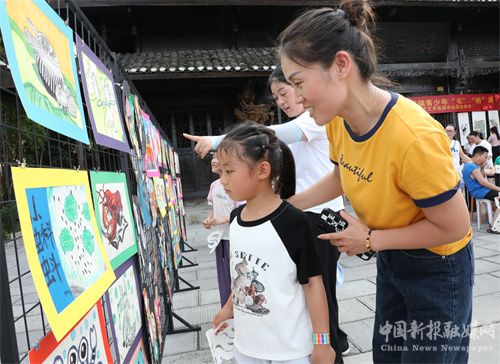 7月4日,在湖南省龍山縣里耶鎮(zhèn)文化廣場,家長和孩子一起觀摩少年書畫展。連日來,該鎮(zhèn)文化綜合服務(wù)站聯(lián)合源藝藝術(shù)培訓(xùn)中心開展少年兒童書畫作品展,孩子們用繪畫的形式、獨特的視角和稚嫩的筆觸彩繪出生活中的點滴,以豐富他們的暑期生活。(俞采華 胡榮春)
