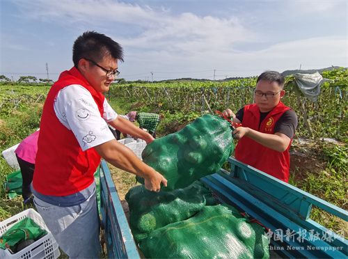2023年7月24日,安徽省合肥市廬江縣石頭鎮(zhèn)黃蜀山村,黨員志愿者和村民一起正在采收貝貝小南瓜。