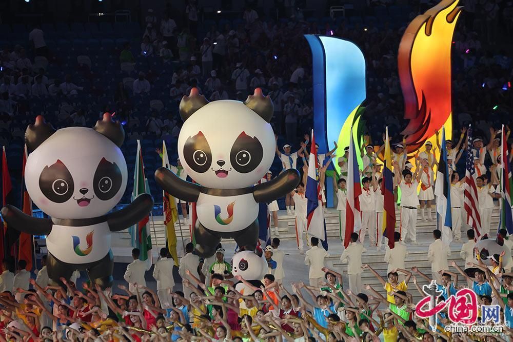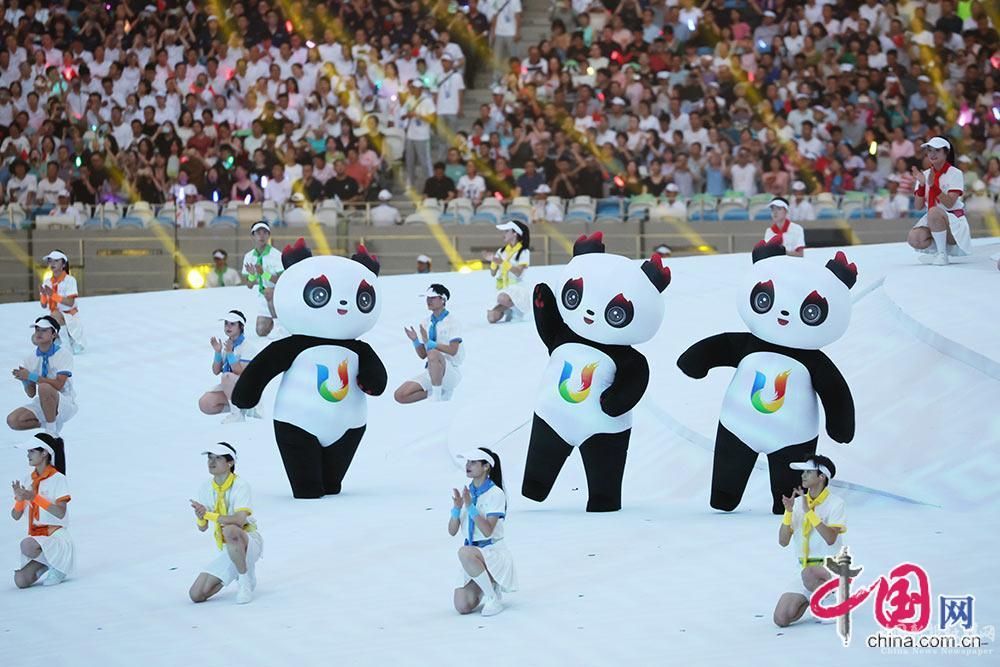 7月28日,大運(yùn)會(huì)吉祥物“蓉寶”在第三十一屆世界大學(xué)生夏季運(yùn)動(dòng)會(huì)開幕式現(xiàn)場熱情表演。中國網(wǎng) 倫曉璇攝影
