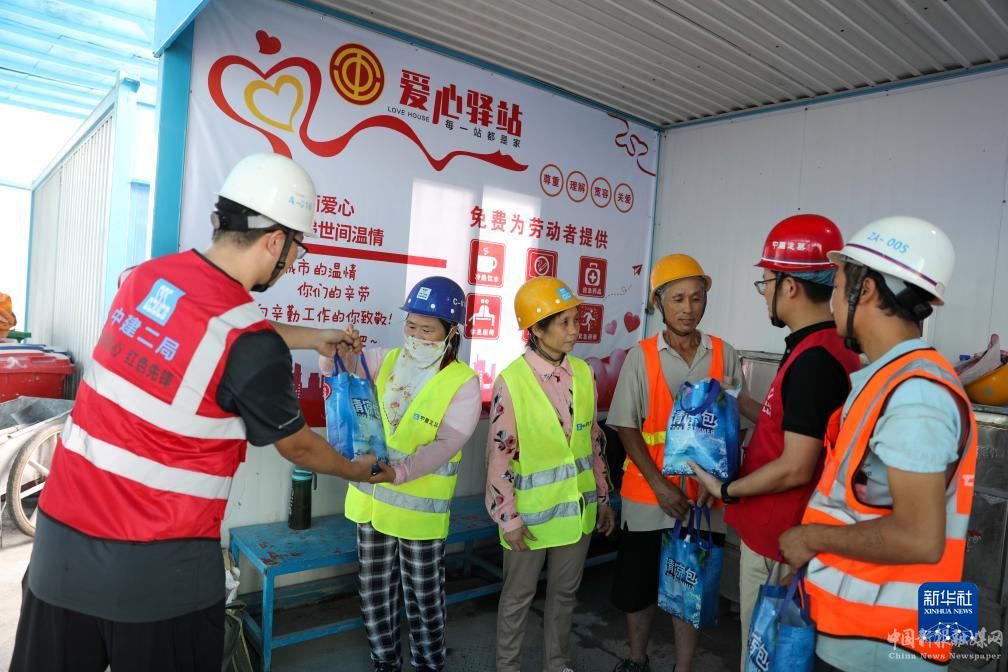 8月1日,中建二局合肥林店家園安置房項目部的工友在服務驛站領取清涼用品。