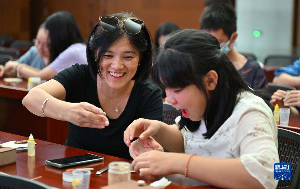 9月29日,家長帶著孩子在位于海南省海口市的海南省博物館參加古法制香牌活動。
