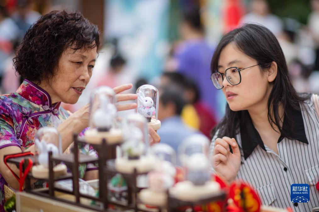 9月29日,游客在湖北省武漢市武昌區(qū)非遺“技·憶”節(jié)活動現(xiàn)場觀看非遺工藝品。