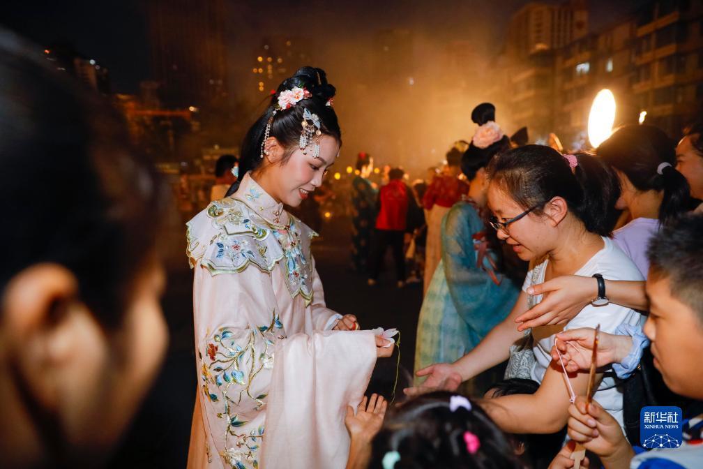 9月29日,在四川省成都市東華門遺址公園,觀眾在沉浸式演出中與演員互動。