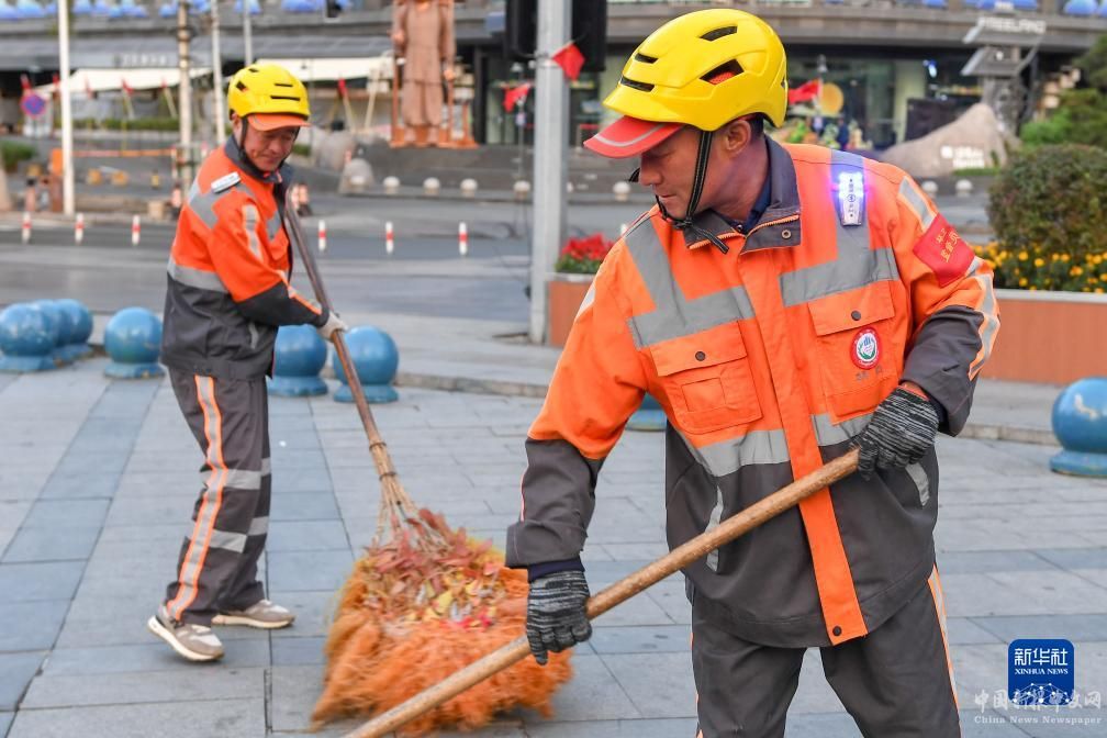 9月30日清晨,在吉林長春市朝陽區(qū)紅旗街與同德路交匯處,環(huán)衛(wèi)工人畢永生(右)、廉士微在清掃人行步道。