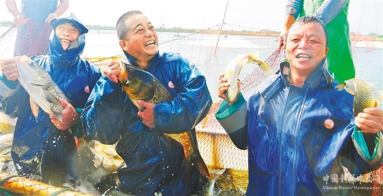?、叽迕裨诮魇≌翗涫醒蠛l(xiāng)荷園村魚塘收網(wǎng)捕魚。 周 亮攝(中經(jīng)視覺)