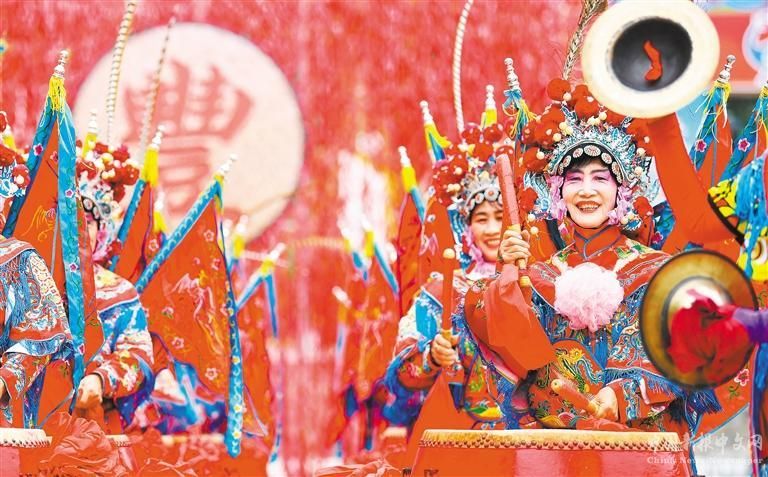 ?、酆颖笔∵w安市楊店子街道,來自唐山的威風(fēng)鑼鼓隊(duì)敲起鑼鼓慶豐收。張澤慧攝(中經(jīng)視覺)