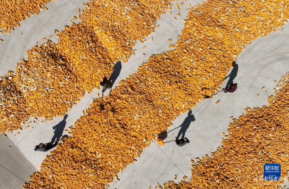 10月7日,在山東省聊城市茌平區(qū)賈寨鎮(zhèn),農(nóng)民在晾曬玉米(無人機(jī)照片)。金秋時節(jié),各地農(nóng)民搶抓農(nóng)時,有序開展秋收、秋種、秋管等農(nóng)事活動,田間地頭呈現(xiàn)一派繁忙景象。新華社發(fā)(趙玉國 攝)