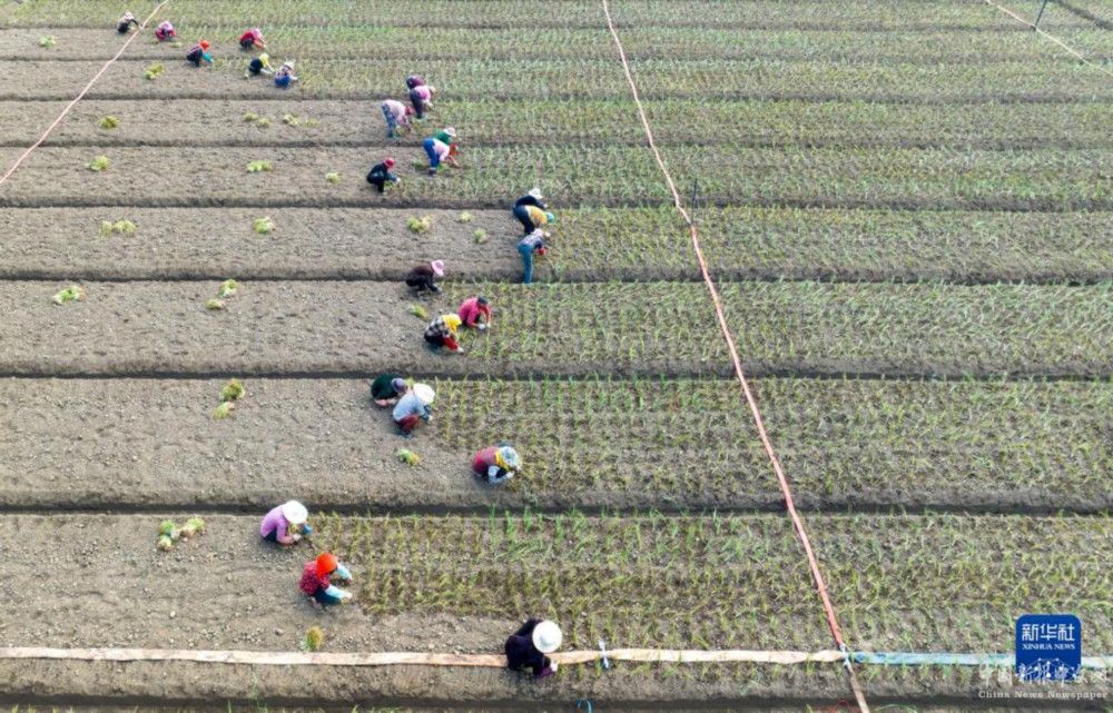 10月9日,農(nóng)民在江蘇省興化市大垛鎮(zhèn)種植香蔥(無人機(jī)照片)。金秋時節(jié),各地農(nóng)民搶抓農(nóng)時,有序開展秋收、秋種、秋管等農(nóng)事活動,田間地頭呈現(xiàn)一派繁忙景象。新華社發(fā)(周社根 攝)
