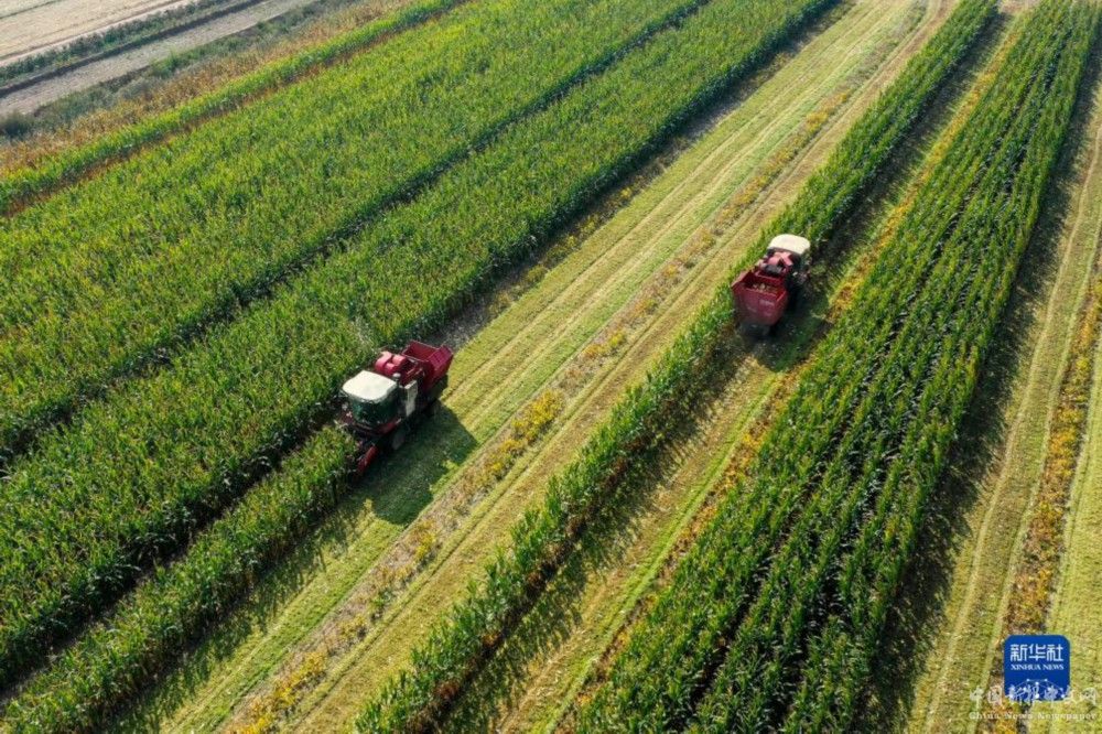 10月9日,在山東省東營市廣饒縣花官鎮(zhèn),大型收割機(jī)收獲玉米(無人機(jī)照片)。金秋時節(jié),各地農(nóng)民搶抓農(nóng)時,有序開展秋收、秋種、秋管等農(nóng)事活動,田間地頭呈現(xiàn)一派繁忙景象。新華社發(fā)(劉云杰 攝)