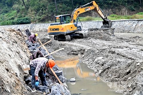 10月12日,湖南省隆回縣辰水第三期治理工程金石橋鎮(zhèn)蔡花村河段機(jī)聲隆隆,挖掘機(jī)正在施工作業(yè),工人正在砌河堤,一片忙碌景象。