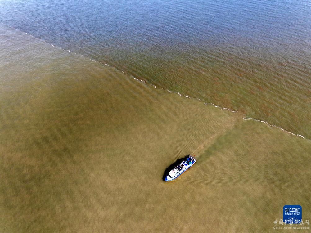 在山東省東營(yíng)市黃河入???,黃河匯入渤海。黃色的河水和藍(lán)色的海水之間形成了一條“分界線”,河黃海清,涇渭分明。