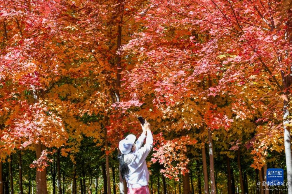 10月21日,游客在河北省遵化市鐵廠鎮(zhèn)林地賞景拍照。