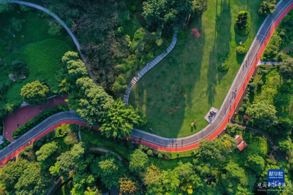 10月21日,市民和游客在重慶渝北龍頭寺公園運動、游玩(無人機照片)。