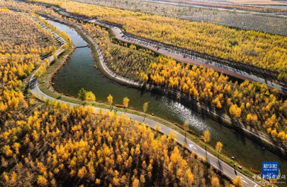 10月21日在甘肅省張掖市甘州區(qū)奧林匹克森林公園拍攝的金色的胡楊林(無人機照片)。