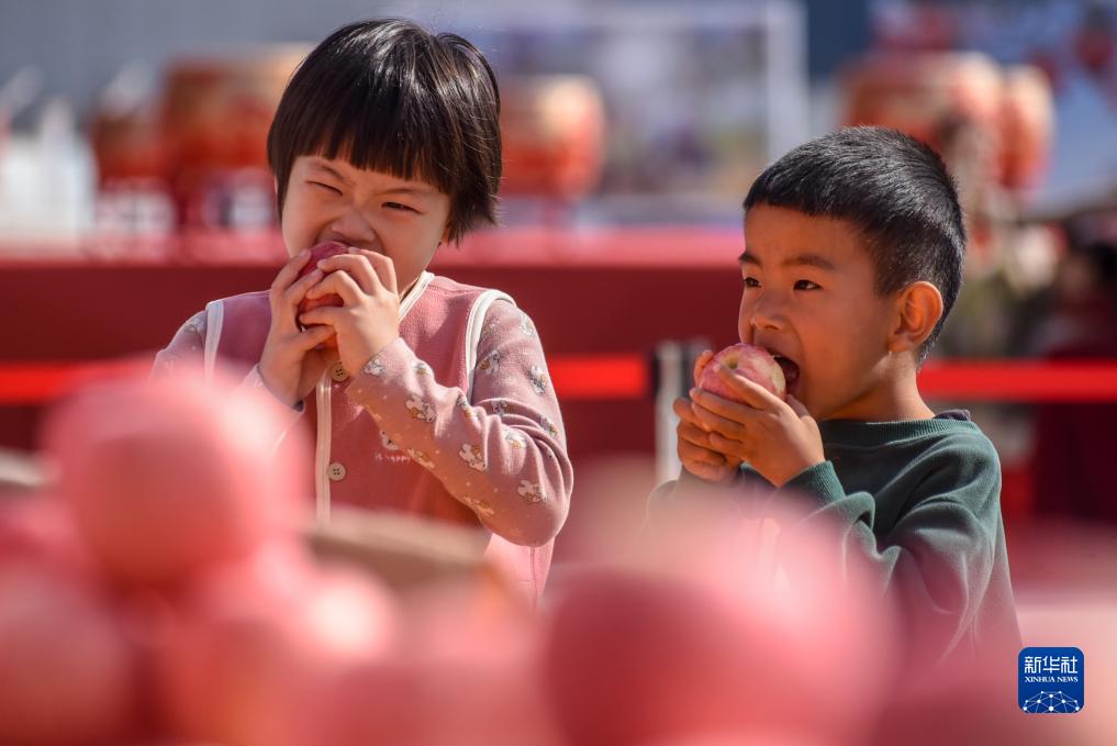 10月22日,兩名小朋友在山東沂源蘋果節(jié)上品嘗參展蘋果。