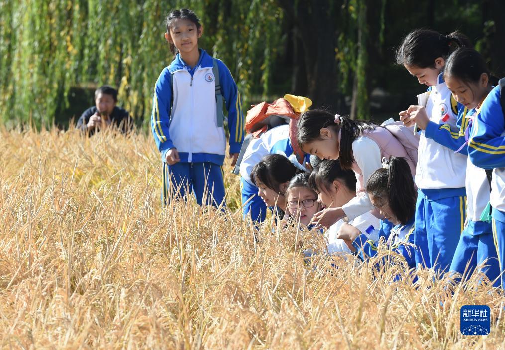 10月27日,來自中國農(nóng)業(yè)科學(xué)院附屬小學(xué)的學(xué)生在圓明園“多稼如云”景區(qū)的稻田邊觀察稻谷。