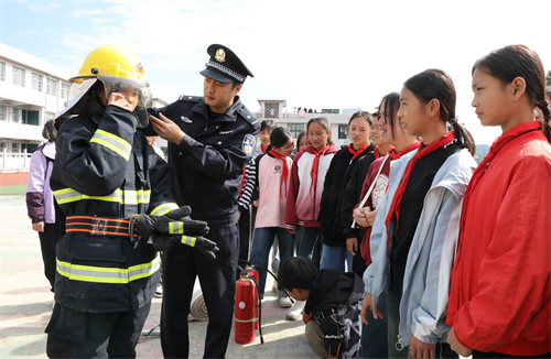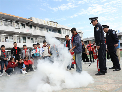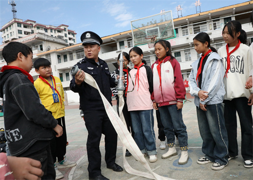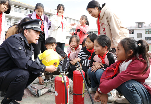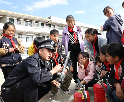 11月7日,湖南省保靖縣公安局的民警在毛溝小學(xué)給學(xué)生講解消防安全知識。在“119全國消防日”前夕,該縣公安局組織民警深入中小學(xué)學(xué)校,開展“消防安全進(jìn)校園”活動,通過消應(yīng)急滅火演練、學(xué)習(xí)滅火器使用等消防知識宣傳和實踐活動,幫助學(xué)生提高消防安全意識,增強(qiáng)火災(zāi)逃生自救能力。( 俞采華 胡 勝)