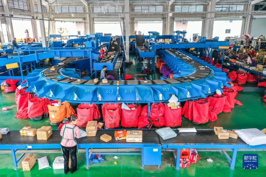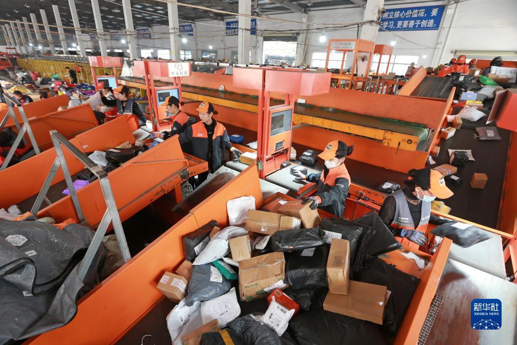11月9日,在安徽省淮北市鳳凰山電商快遞物流園,工作人員在分揀車間忙碌。