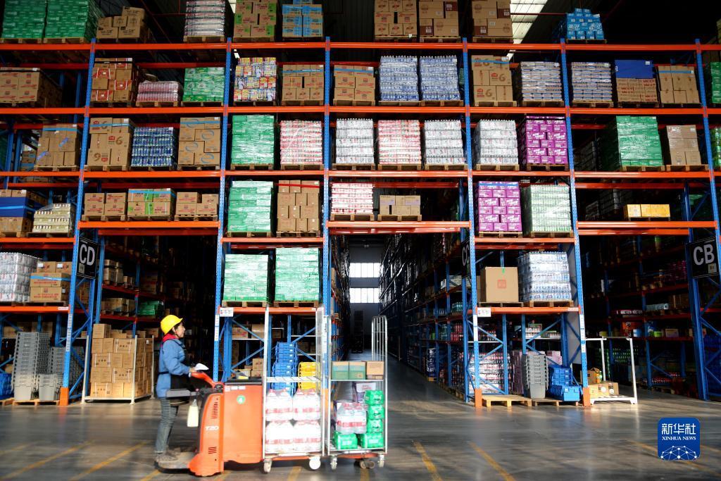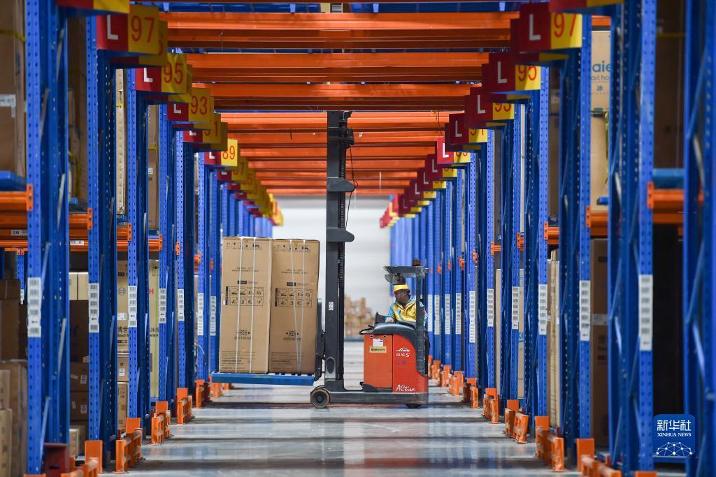 11月10日,在位于江蘇省南京市江寧區(qū)的蘇寧華東物流中心,工人駕駛叉車運(yùn)輸商品。