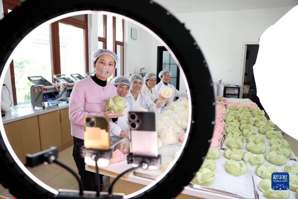 11月8日,山東省青島西海岸新區(qū)海青鎮(zhèn)共富電商直播基地,志愿者在直播售賣海青花饃。