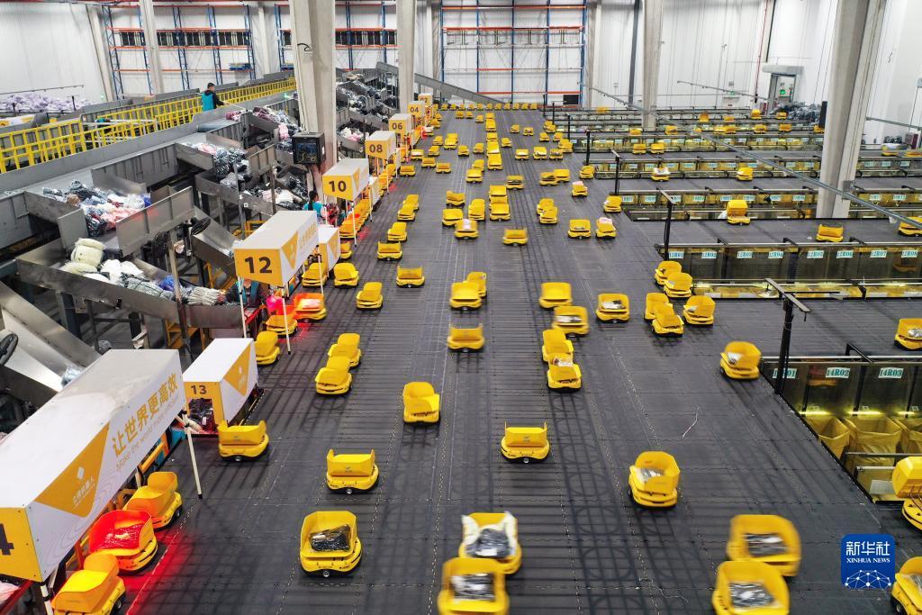 11月8日,浙江省湖州市德清縣乾元鎮(zhèn)第一產(chǎn)業(yè)智慧物流園區(qū),分揀“小黃人”機(jī)器人在精準(zhǔn)配送各類服飾(無(wú)人機(jī)照片)。
