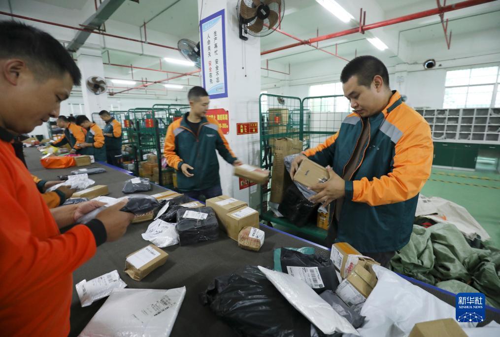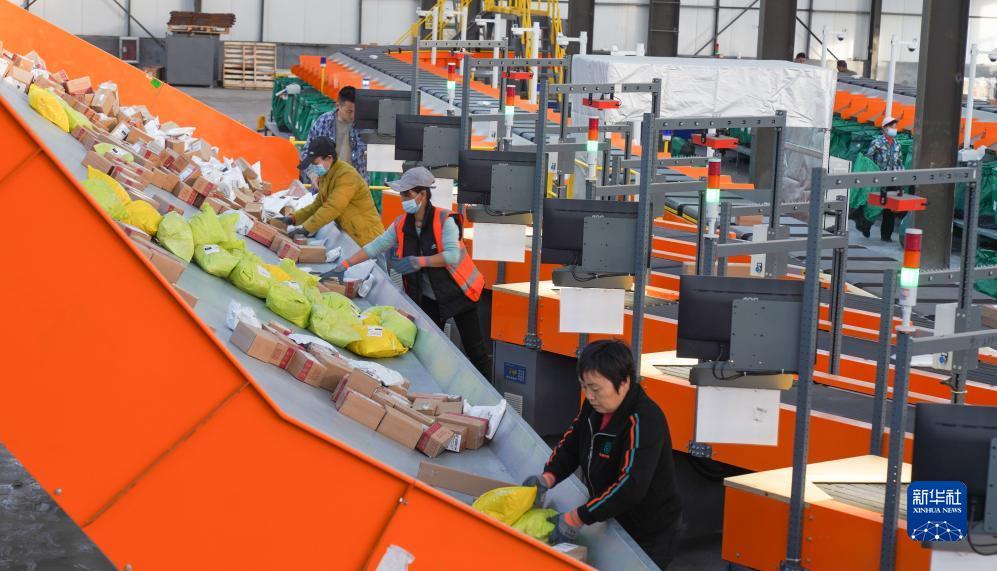 11月9日,河北省遵化市郵政快遞公司的工作人員在車間分揀收寄的快件。