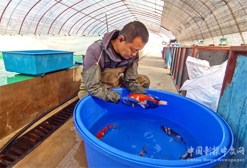 2023年11月14日,在安徽省合肥市廬江縣臺灣農(nóng)民創(chuàng)業(yè)園常豐村錦鯉產(chǎn)業(yè)園,錦鯉養(yǎng)殖戶史光平兄弟正在管理、挑選錦鯉供應市場。