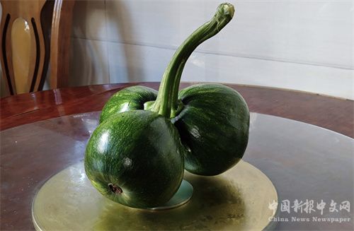 這3個并蒂南瓜還處在生長期,表皮青翠發(fā)亮,個頭大小均勻,總重量5斤9兩。根據(jù)有關(guān)資料,只要種植過程得當(dāng),這種并蒂南瓜可以食用。