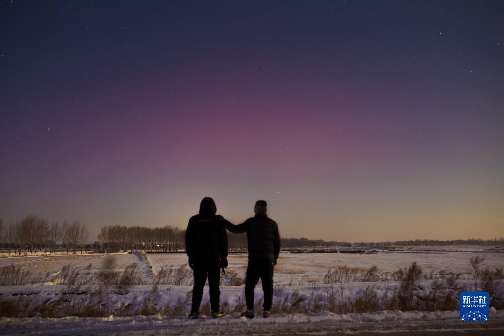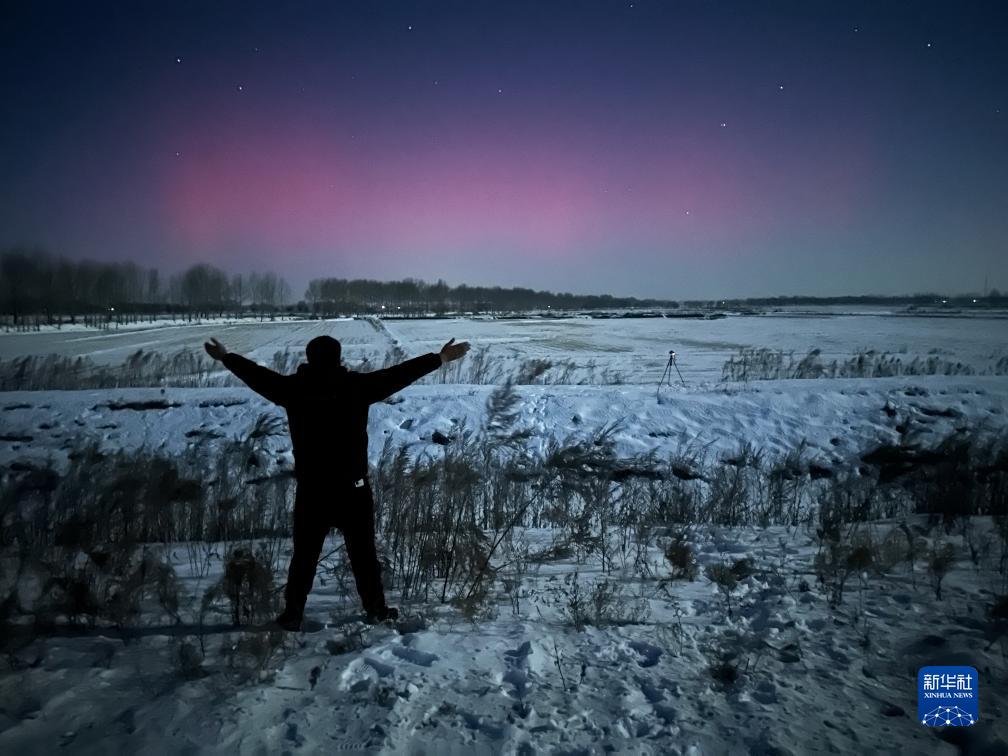 12月1日晚,在黑龍江省佳木斯市,攝影愛好者在極光下留影。