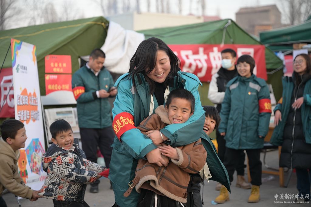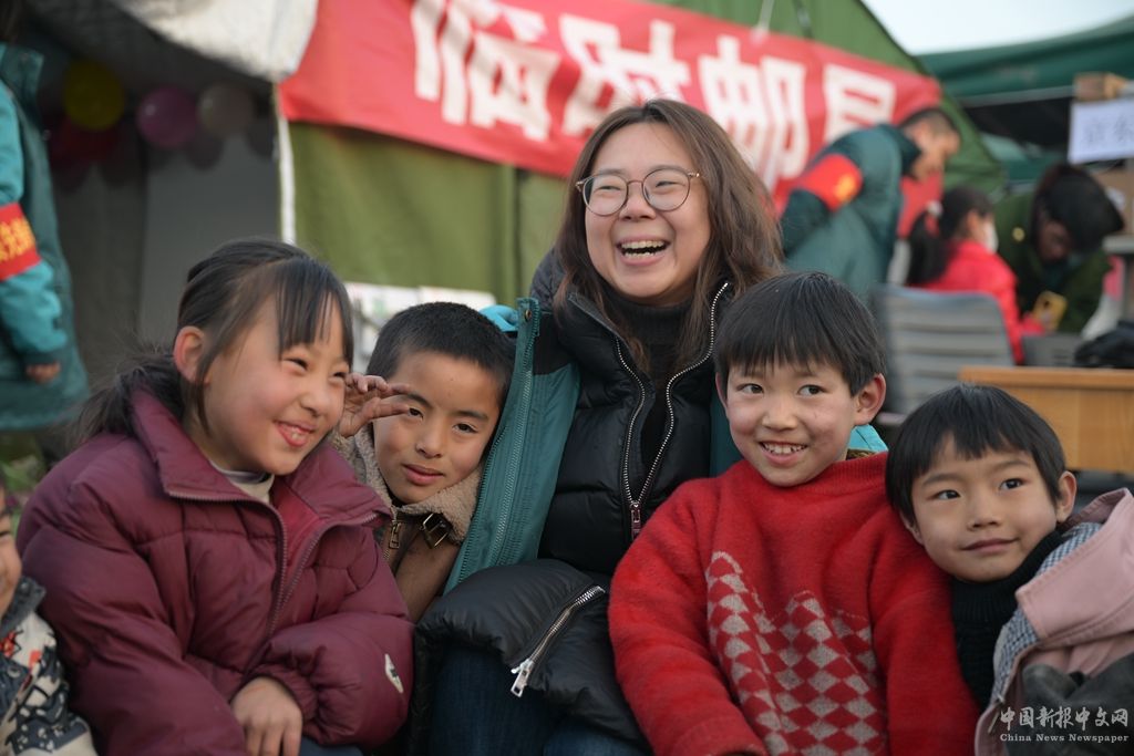工作人員們暫時放下手中的工作,陪在災難中受到驚嚇和困擾的孩子們玩起游戲。攝影:積石山縣融媒體中心李華